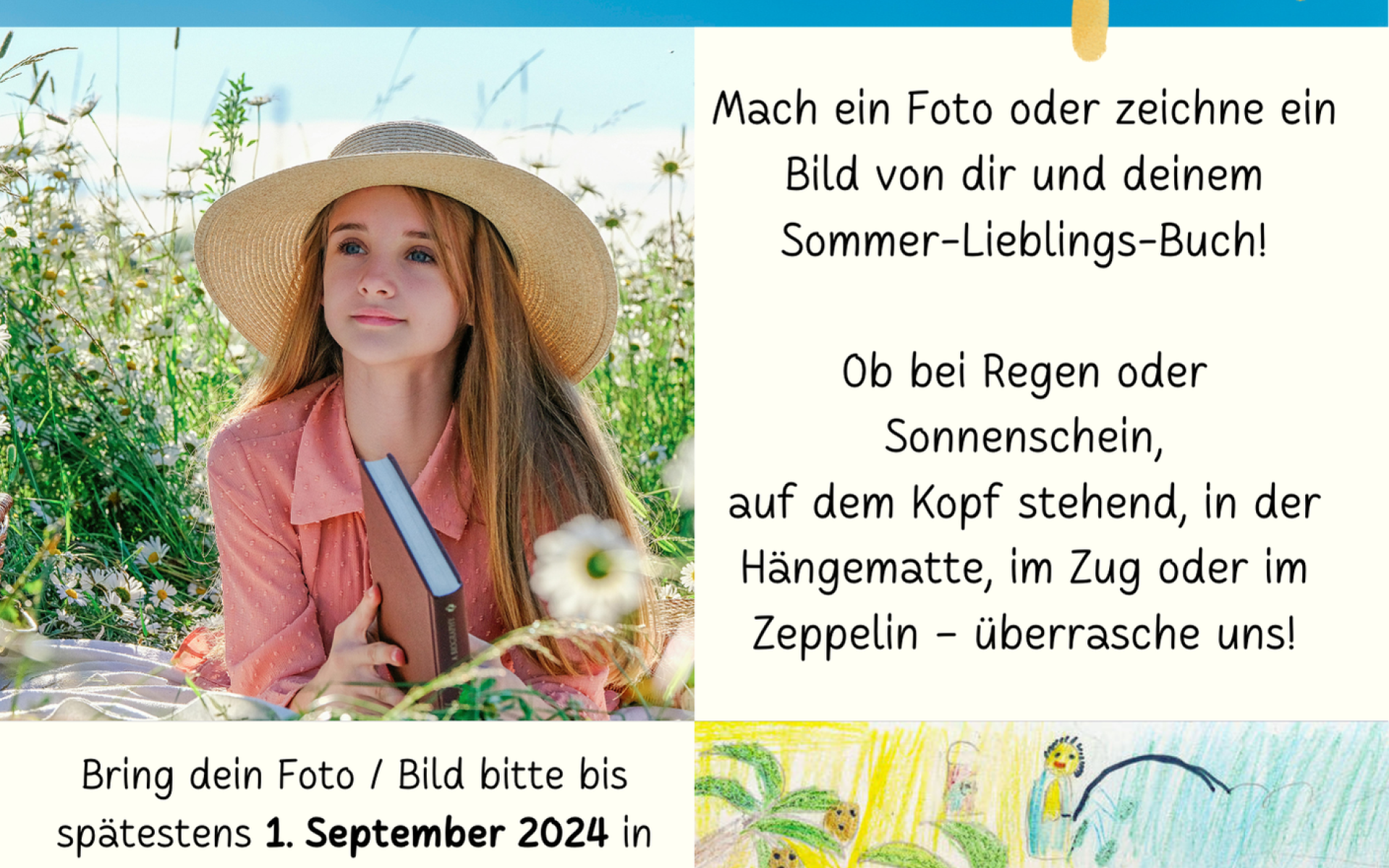 Macht mit bei unserem Sommergewinnspiel. Schickt uns ein Foto oder ein gemaltes Bild von Euch und eurem Lieblingsbuch an einem wunderschönen Ort und gewinnt einen unserer tollen Preise.